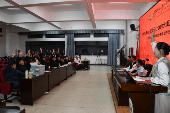 在场的同学们专注地听,用心地感受这一次次震撼心灵的分享,在嘉宾狄文科同志的讲述与鼓励中所有人又红了眼眶,“2016年底摔伤导致截瘫,一级残疾。2021年6月参加中华人民共和国第十一届残疾人运动会,获得轮椅舞蹈(国标舞)全国第二名和第八名。”“2021年12月参加内蒙古残联举办的希望之家自助互助培训班后通过内蒙古残联推荐加入草原大爱歌舞情景剧团队,在剧中扮演长大后的残障孤儿,从此开启排练、学习、演出生涯。”